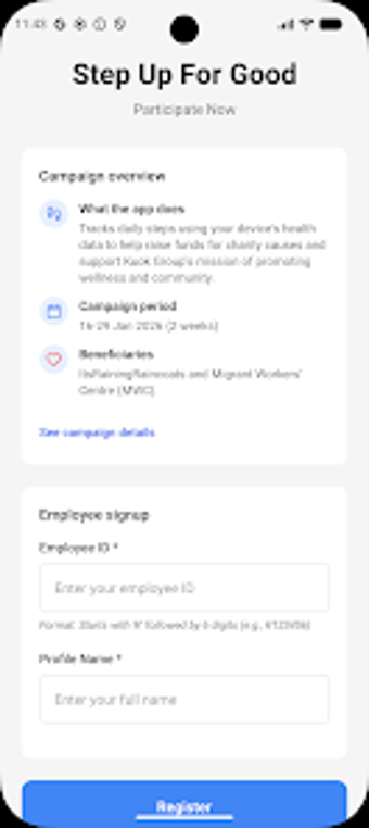 KGSg Step Up For Good es una plataforma de bienestar corporativo diseñada para los empleados del Kuok Group Singapore. Esta aplicación convierte la actividad física diaria en impacto real mediante iniciativas de recaudación de fondos. Al caminar, los usuarios contribuyen a la comunidad de trabajadores migrantes, ya que por cada 10 pasos dados, se donan SGD$0.01 a la causa. Además, cuenta con un tablero de impacto en vivo que muestra los pasos totales y el progreso hacia el objetivo de recaudación.